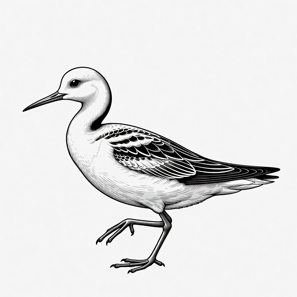animal, avian, bird, black wings, clipart, drawing, feathers, illustration, isolated background, line art, long bill, nature, one leg, sandpiper, shorebird, standing bird, white bird, wildlife, sanderling