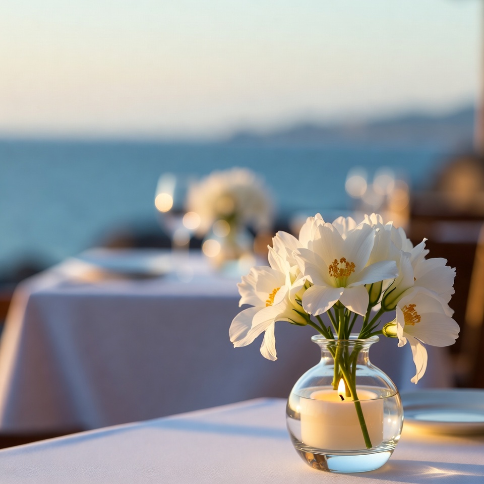 blurred background, bokeh effect, candle, daffodils, dining table, floral arrangement, glass vase, golden light, lit candle, narcissus, ocean view, outdoor table, plates, restaurant, sea background, seaside, sunset, table setting, white tablecloth, wine glasses, white flowers