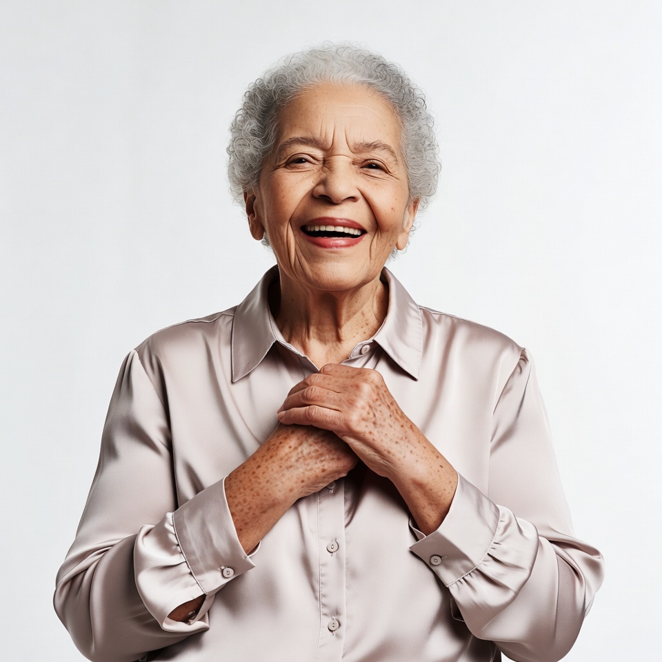 An elderly African-American woman with short gray curly hair smiles warmly at the camera. She wears a shiny silver collared blouse and clasps her hands together in front. Her skin shows age spots, and she stands against a plain white background.