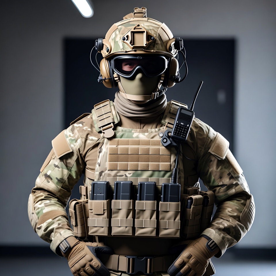 A soldier stands in full tactical gear with a tan helmet, goggles, and camouflage uniform. He wears a plate carrier loaded with magazines and a radio on his chest, with gloved hands at his sides. The background features a dark door and dim lighting.