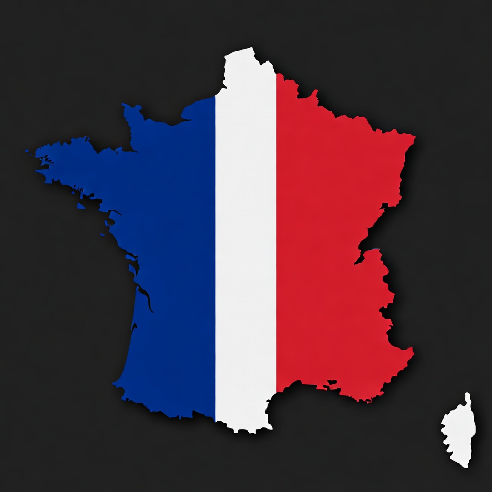A silhouette outline of France's map shaped as the national flag with blue on the left, white vertical stripe in the center, and red on the right. The design features a dark background and includes the small island of Corsica. The image has a clean, vector-style appearance.