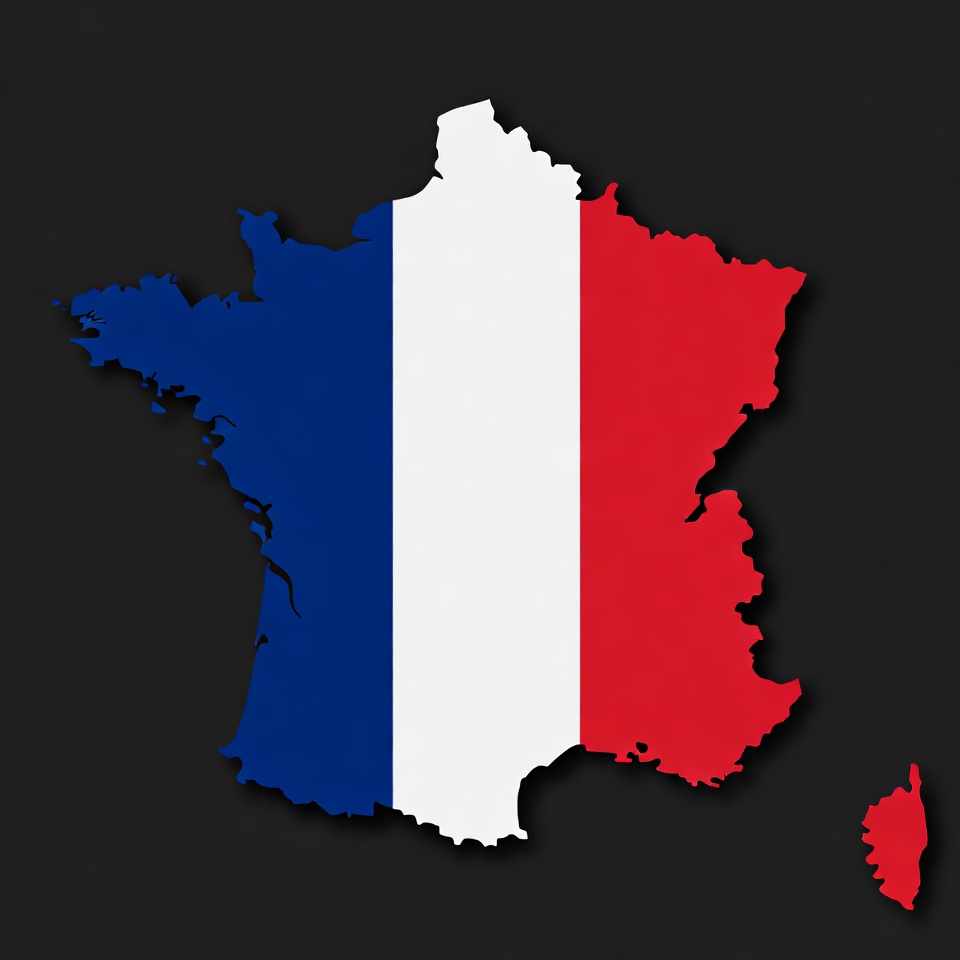 A vector illustration of the France map shaped as the national flag. The map features blue on the left, white in the center, and red on the right, with a dark background. It includes the outline of Corsica.
