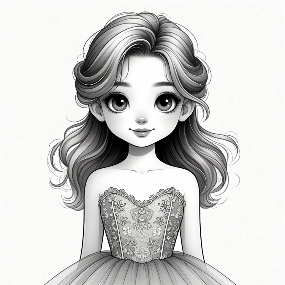 White, anime style, ball gown, black and white, cute, drawing, female, girl, illustration, kawaii, lace dress, large eyes, line art, off-shoulder, portrait, tulle skirt, updo hairstyle, wavy hair, chibi girl