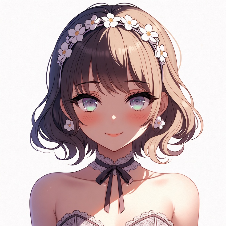 Asian, black bow, black hair, blonde hair, blush, choker, clipart, cute, daisy crown, earrings, female, flowers, green eyes, heterochromia, illustration, isolated background, kawaii, lace top, portrait, smile, split hair, wavy hair, anime girl