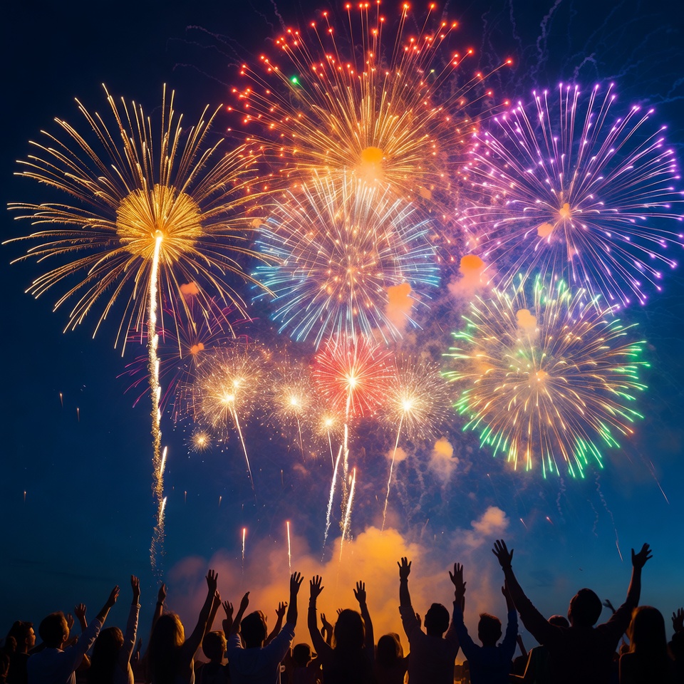 celebration, cheering crowd, colorful fireworks, crowd, dark background, exploding fireworks, festive display, green fireworks, group cheering, hands up, night celebration, night sky, orange fireworks, outdoor event, people, purple fireworks, pyrotechnics, raised hands, red fireworks, silhouette, vibrant colors, yellow fireworks, fireworks