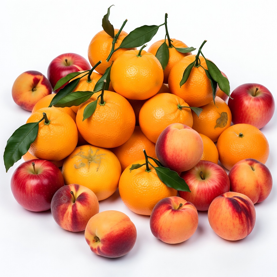 apples, citrus, fresh fruit, fruit arrangement, fruit pile, green leaves, healthy food, mixed fruits, orange fruit, peaches, produce, red apples, ripe fruit, white background, oranges