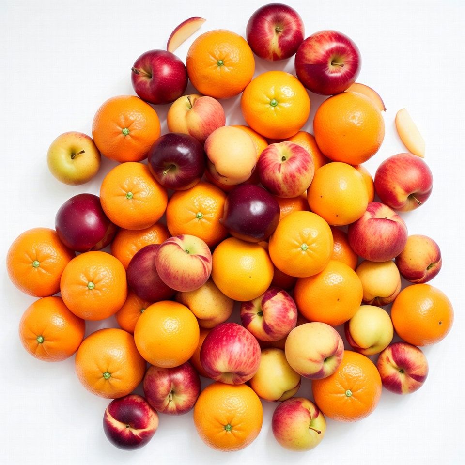 apples, citrus, food photography, fresh fruit, fruit arrangement, green apples, juicy, mixed fruits, peaches, pile, produce, red apples, sliced fruit, vibrant colors, white background, oranges