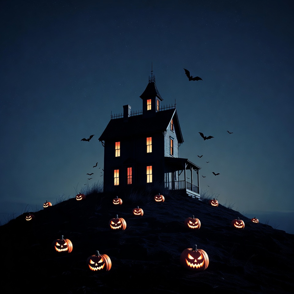 A tall, dark haunted house with glowing windows sits atop a hill covered in orange jack-o'-lanterns at night. Bats fly around the steepled roof and porch under a starry sky. Tall grass surrounds the base of the eerie mansion.