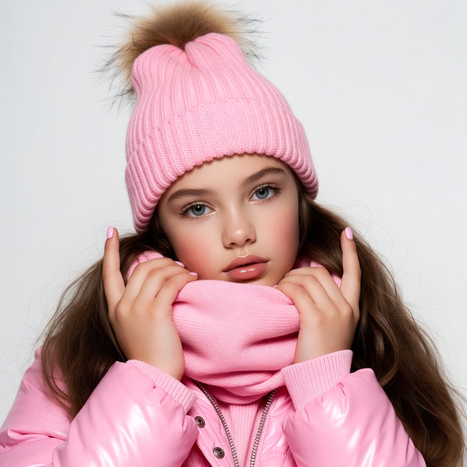 A young girl with long wavy brown hair and blue eyes wears a fluffy pink beanie hat and matching pink scarf. She holds the scarf up to her face with both hands while dressed in a shiny pink puffer coat. She stands against a white background.