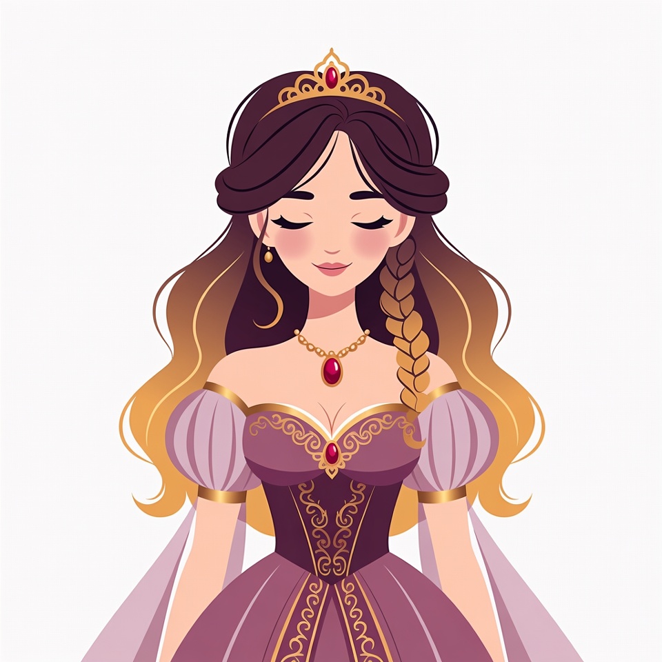 White, beautiful, braided hair, brown hair, character design, clipart, crown, digital art, earrings, elegant, fairy tale, fantasy, feminine, gold embroidery, illustration, isolated background, long hair, necklace, portrait, purple gown, red gems, regal, tiara, woman, princess