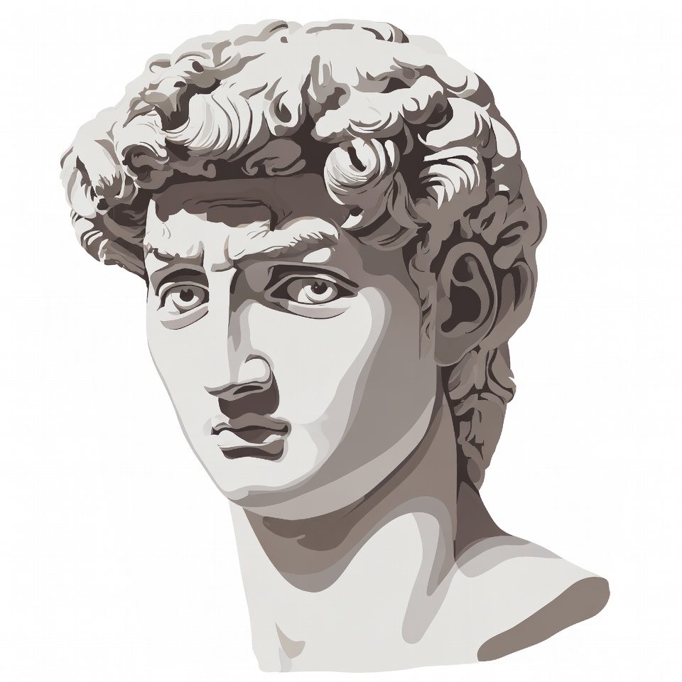 Michelangelo David, Renaissance art, White, ancient sculpture, artistic illustration, bust portrait, classical sculpture, clipart, curly hair, detailed drawing, famous statue, grayscale, head shoulders, illustration, isolated background, male, male bust, marble bust, statue bust, vector art, David statue