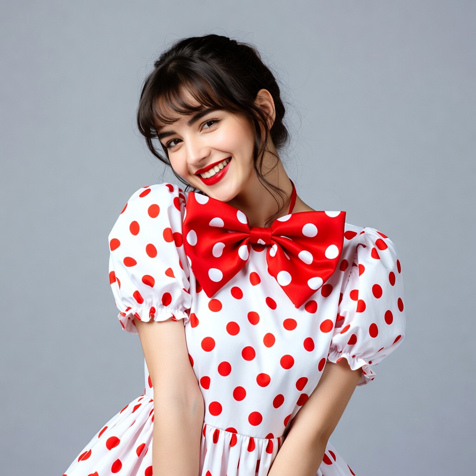 A young Asian woman with long dark hair and bangs smiles happily while wearing a white polka dot dress with puffed sleeves. She has a large red bow tie at the collar and poses playfully against a plain gray background. Her makeup includes red lips and she tilts her head slightly.