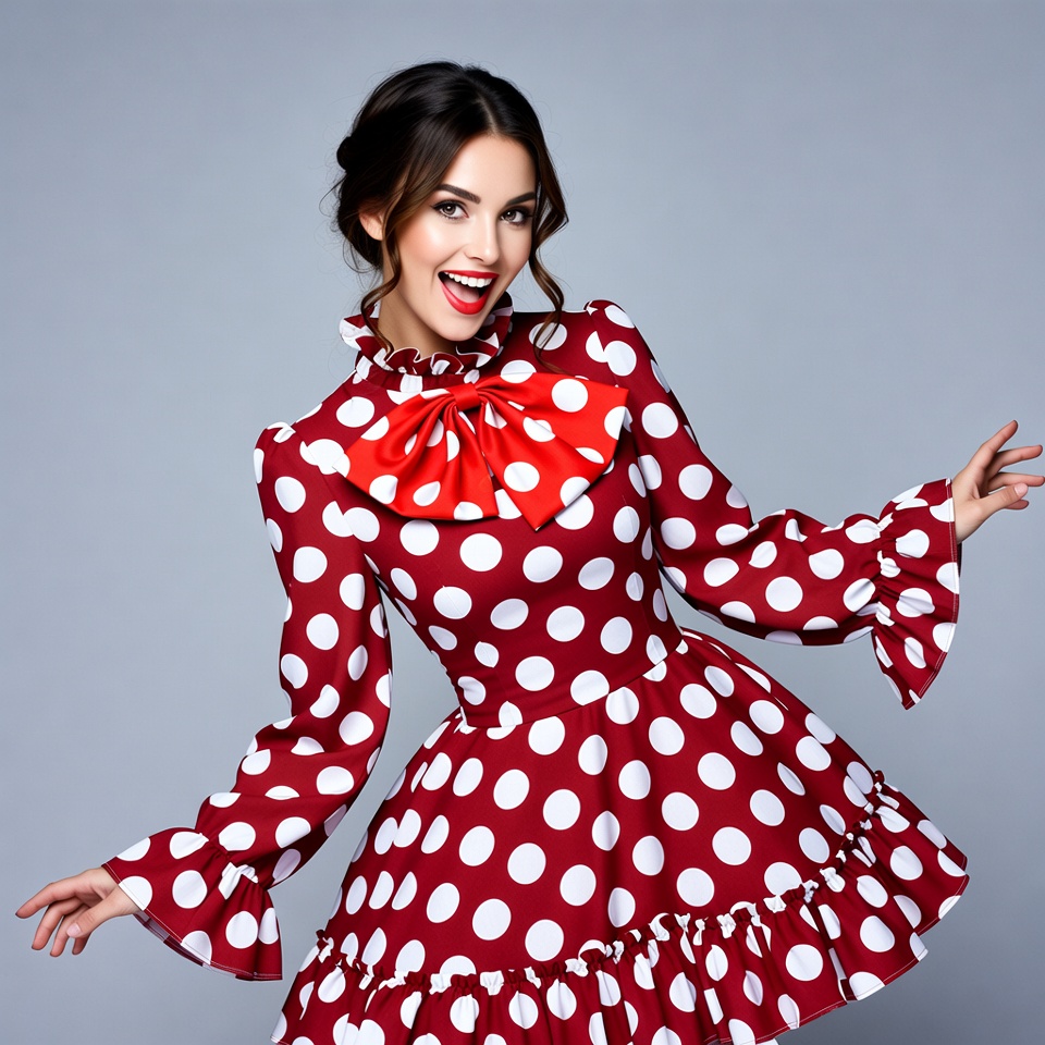 A young woman with dark updo hair smiles widely with red lipstick while wearing a red polka dot dress with a large red bow collar and ruffled sleeves. She poses with arms outstretched on a gray background. The dress features white dots and a flared skirt.
