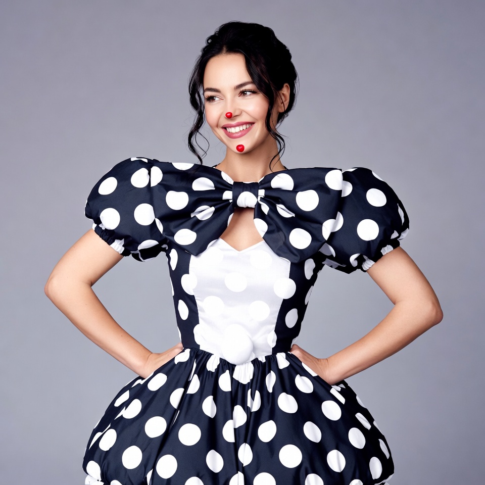 A woman with dark curly hair styled in an updo wears a black polka dot dress with puffed sleeves, a large black bow, and white accents. She has red clown nose and makeup, smiling playfully with hands on hips. She stands against a plain gray background.