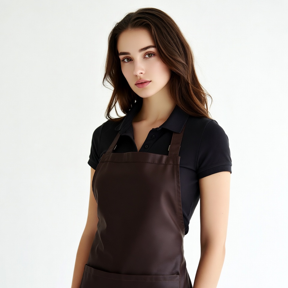 A young woman with long brown hair stands against a white background wearing a black polo shirt and a brown apron. She faces the camera directly with a neutral expression. Her arms hang relaxed at her sides.