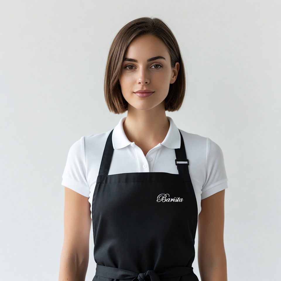 A young woman with shoulder-length brown hair and almond-shaped eyes stands smiling at the camera. She wears a white polo shirt under a black apron embroidered with 'Barista' in white script. She poses confidently against a plain white background.