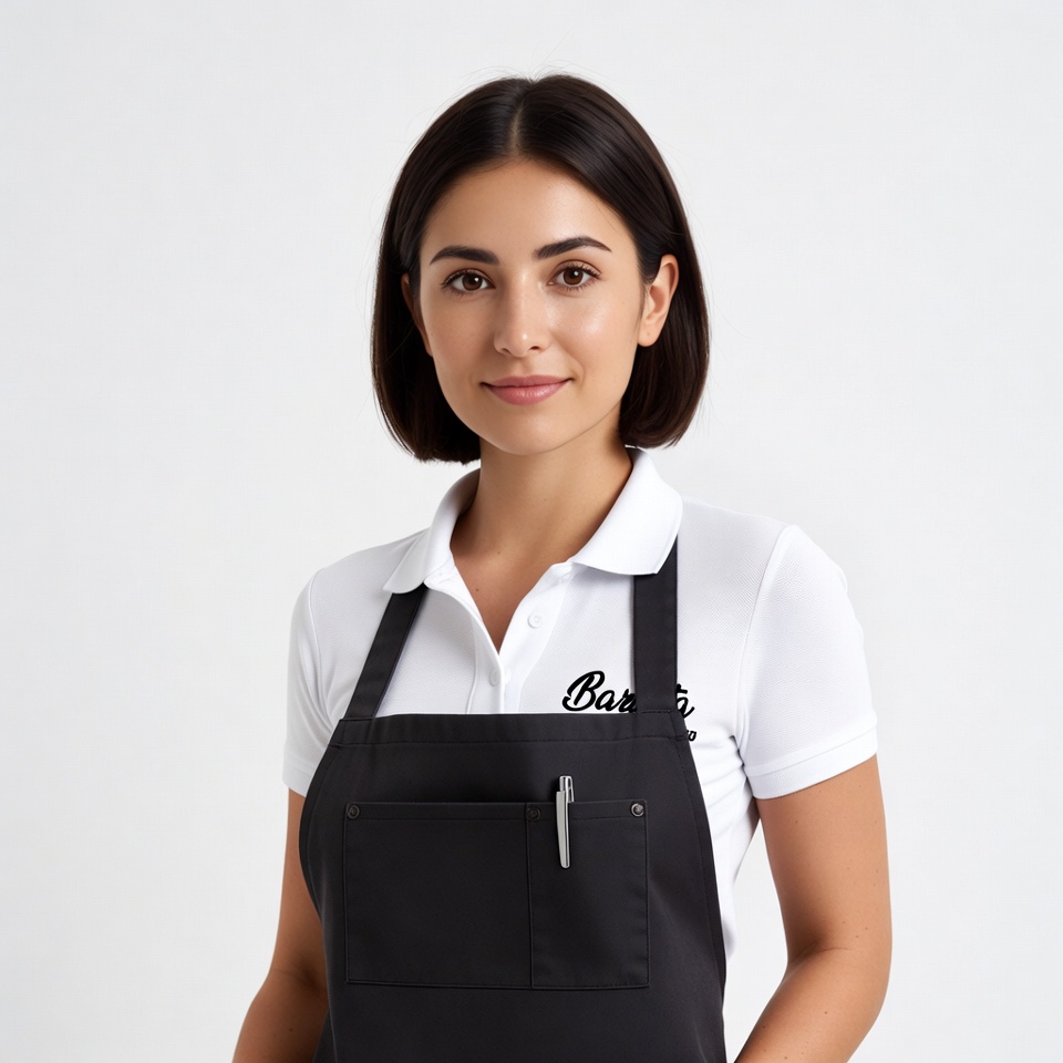 A young Latina woman with short dark hair smiles at the camera while wearing a white collared shirt with 'Barista' embroidered on it and a black apron. She stands confidently with hands on hips against a plain white background. A pen is tucked into the pocket of her apron.