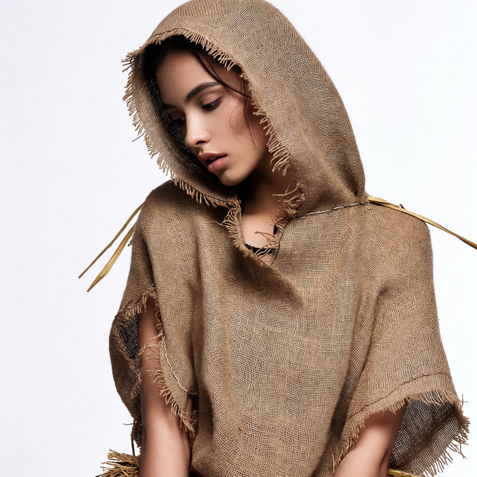 A young woman with dark hair wears a fringed burlap hood and garment with yellow ties. She gazes sideways with a subtle expression against a plain white background. The textured brown fabric drapes loosely over her shoulders.