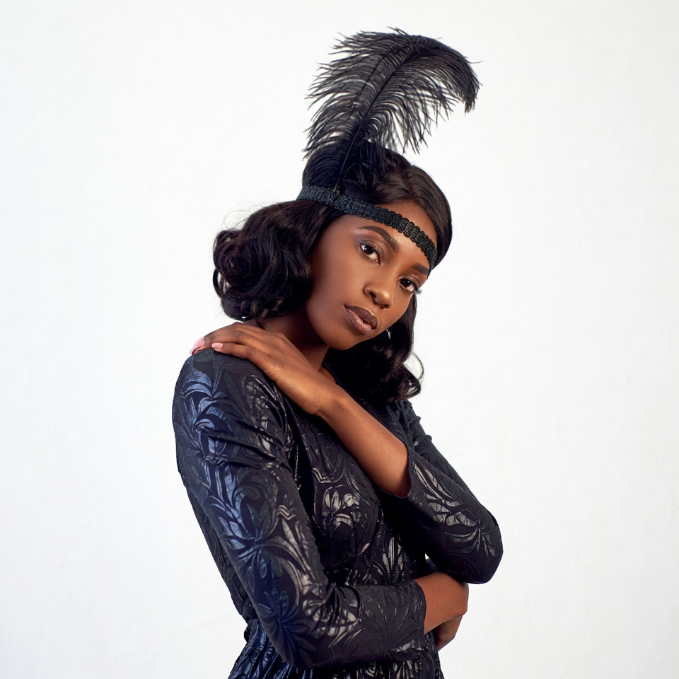 A young African-American woman with curly black hair wears a black beaded headband adorned with large black feathers. She poses with arms crossed, wearing a shiny black patterned dress. The image is set against a plain white background.