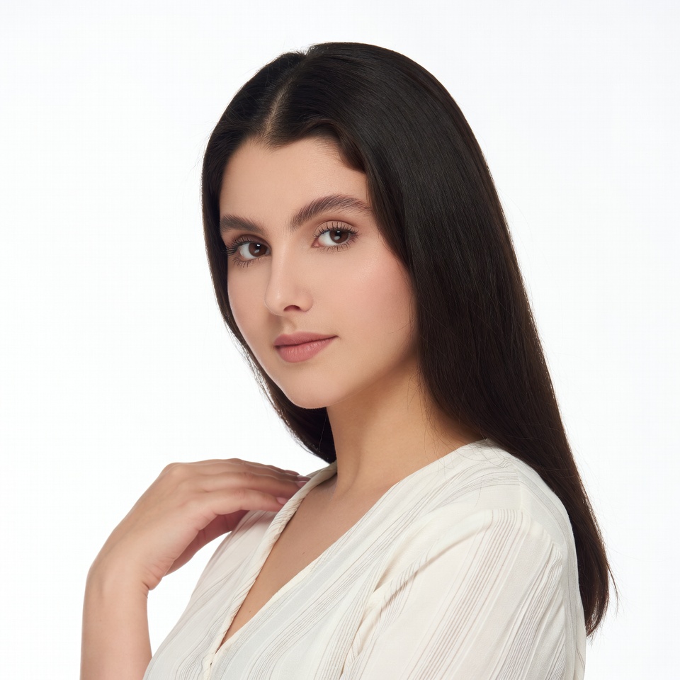 A young woman with straight long black hair looks over her shoulder at the camera. She has light skin, dark expressive eyes, and subtle makeup with pink lips. She wears a white textured blouse and poses with her hand near her neck against a plain white background.