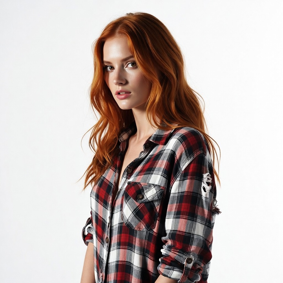 White, attractive woman, beauty, cleavage, fashion, female, ginger hair, headshot, long hair, open shirt, plaid shirt, portrait, red hair, red plaid, redhead, ripped shirt, studio photo, wavy hair, white background, young woman, woman