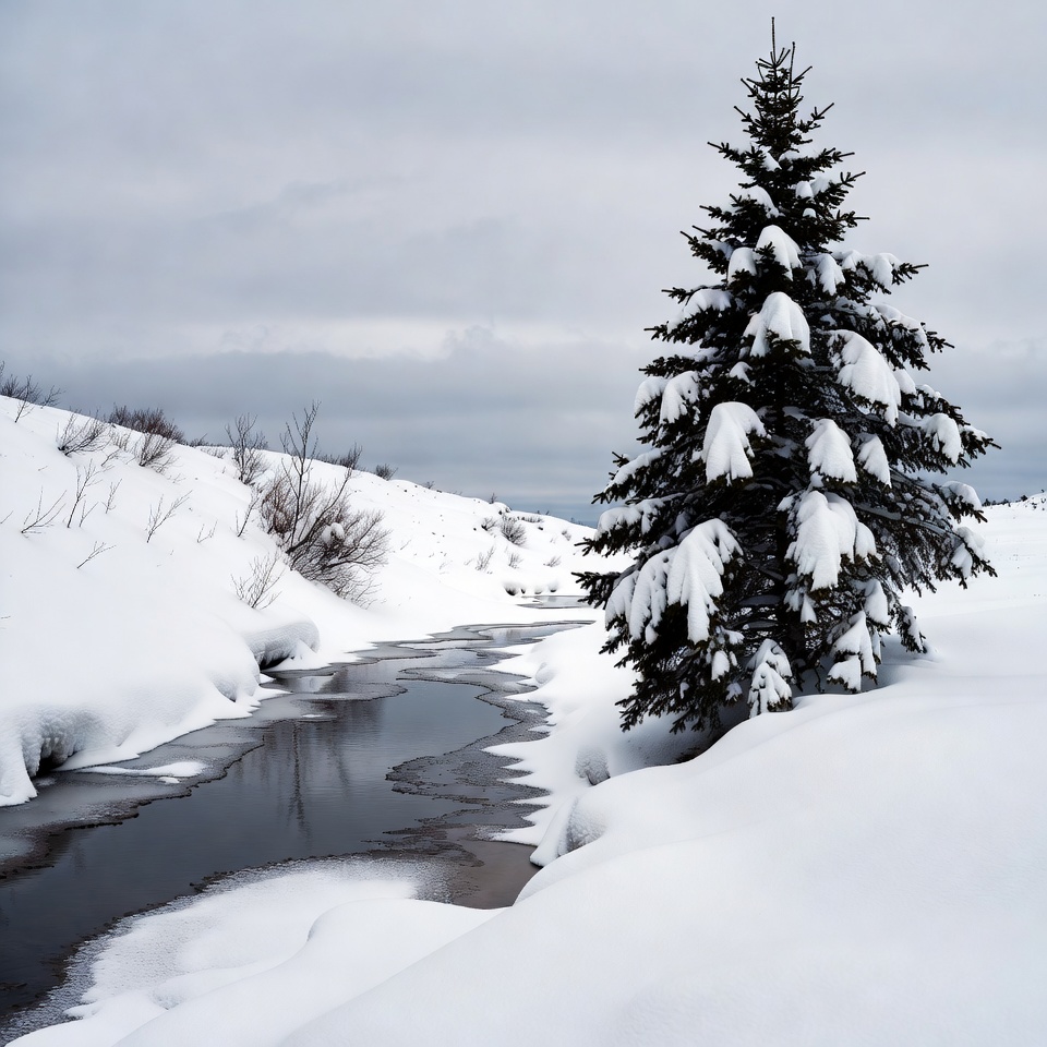 A tall fir tree covered in snow stands prominently beside a winding frozen river. The landscape features snow-covered hills and bushes under a cloudy gray sky. The scene captures a serene winter vista with icy water reflecting the surroundings.