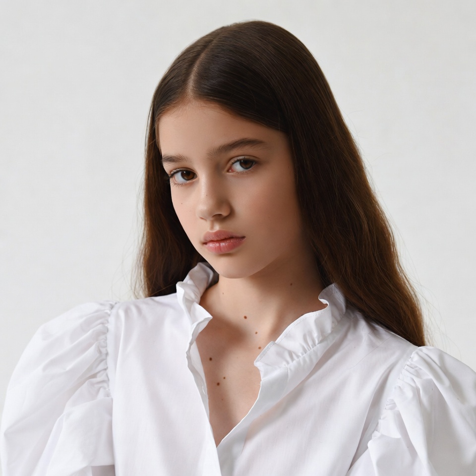 A teenage girl with long straight brown hair stands against a white background. She wears a white blouse with puffed sleeves and ruffled collar, looking directly at the camera with a subtle expression. Her hair frames her face, and she has a few small moles on her neck.