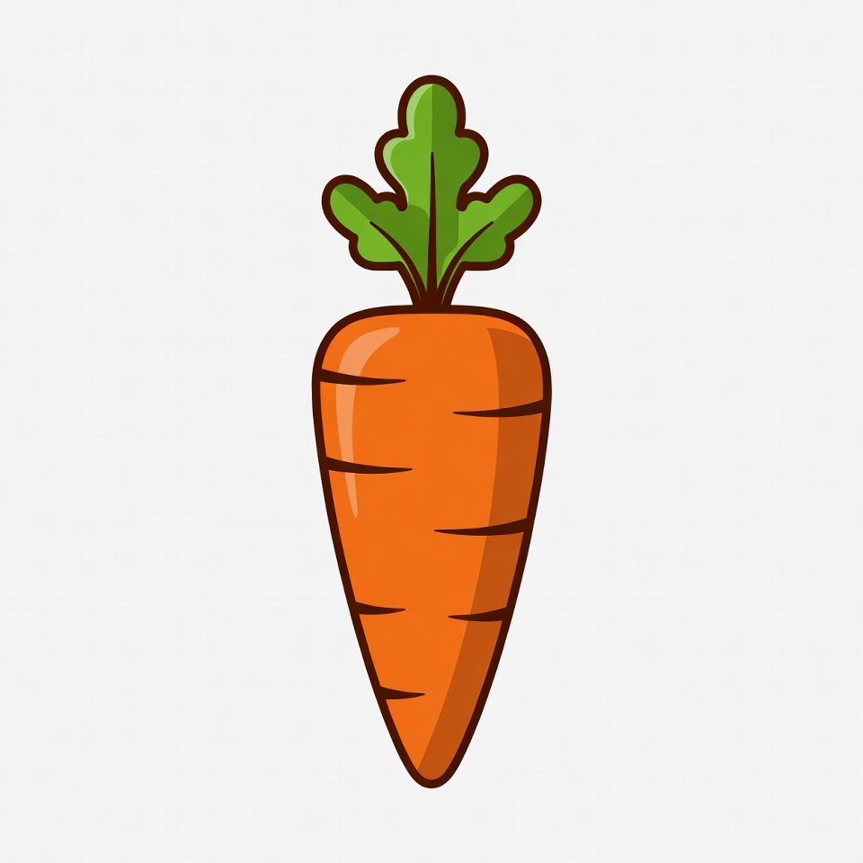 A vibrant orange carrot with green leafy top is illustrated in a cartoon style. It stands upright against a plain white background. The design features smooth outlines and bright colors.