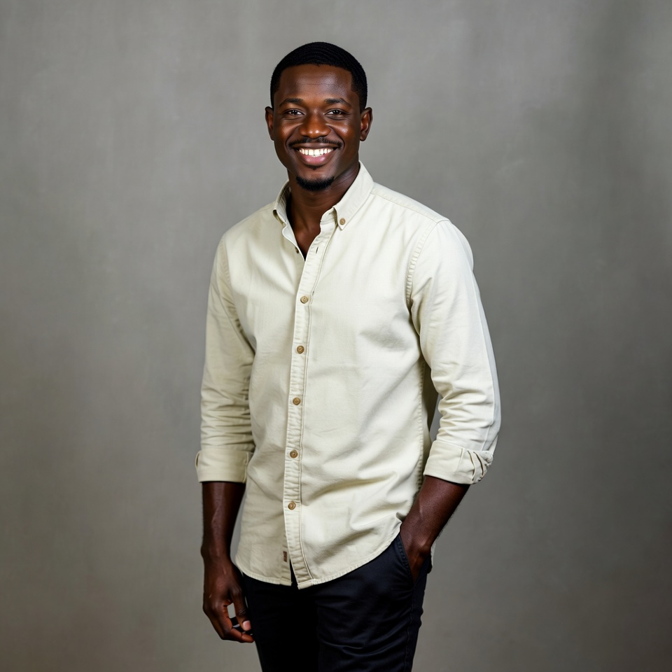 A young African-American man with short black hair stands smiling confidently against a plain gray background. He wears a light beige button-up shirt with rolled sleeves and black pants, with hands in pockets. His expression is warm and approachable.