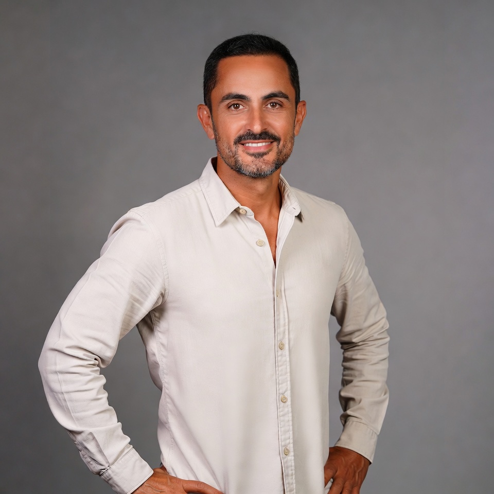 A Middle Eastern man with short dark hair and a trimmed beard stands confidently with hands on hips. He wears a light beige button-up shirt with the top buttons undone. The image features a plain gray background.