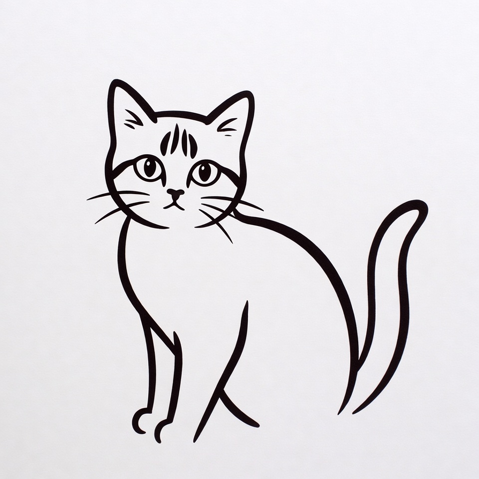 A simple black line drawing of a cute cat sitting with its tail curled around. The cat has large expressive eyes, whiskers, and pointed ears. It is depicted on a plain white isolated background.