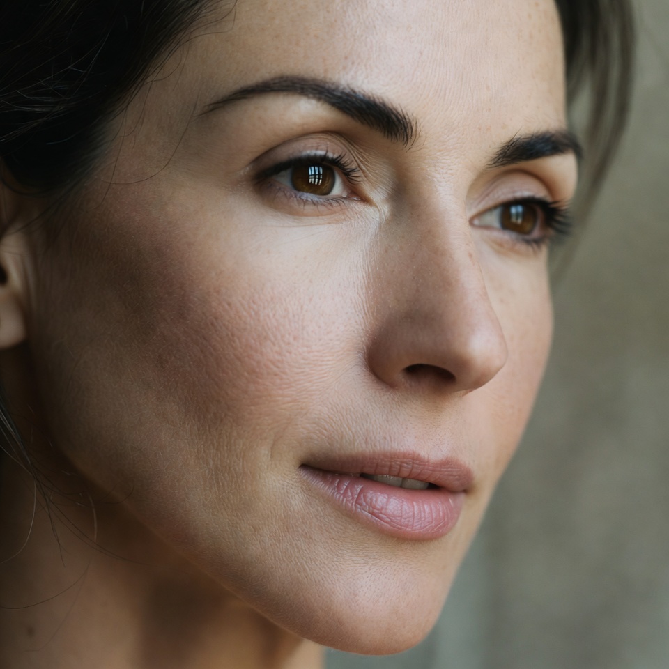 A woman with dark brown hair and brown eyes looks to the side in a close-up portrait. Her smooth skin and subtle makeup highlight her facial features against a neutral background. She has a slight pout with nude lips.