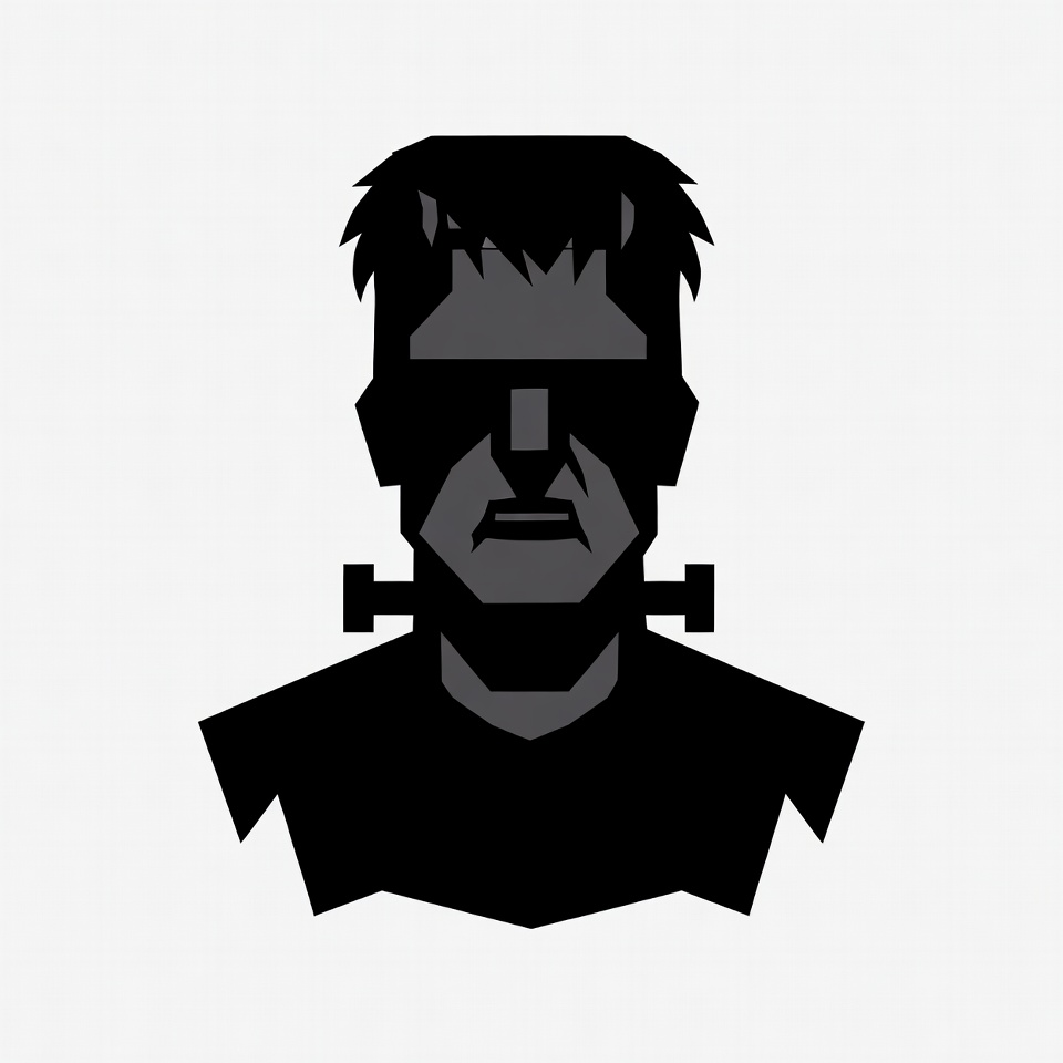 Frankenstein, Halloween, black silhouette, bolts neck, brow ridge, clipart, flat head, geometric art, horror icon, illustration, monster, polygonal, silhouette, vector art, white background, Frankenstein monster