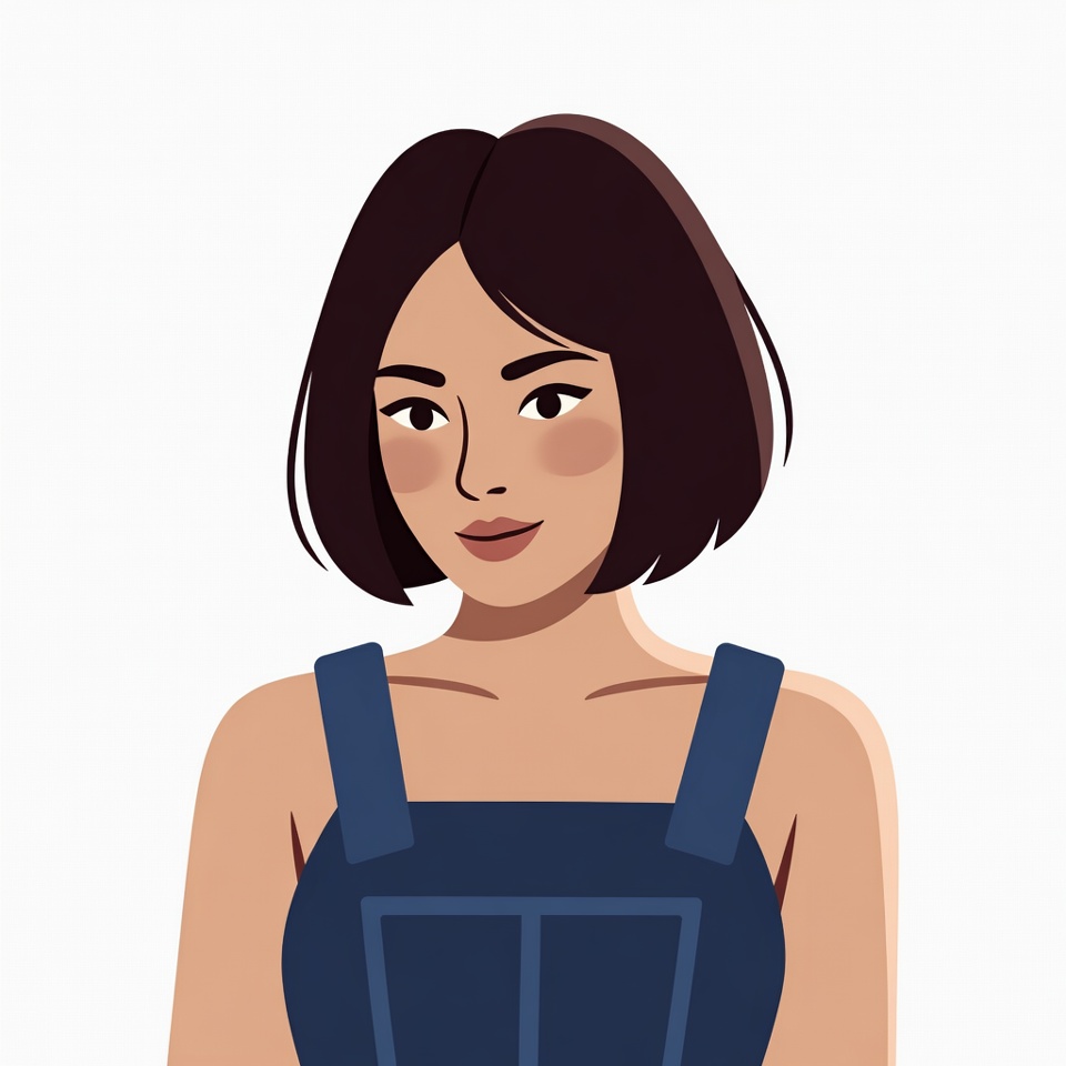 A young Asian woman with short brown bob haircut smiles gently at the viewer. She wears a sleeveless navy blue overall dress with thin straps over bare shoulders. The illustration features a clean white background.