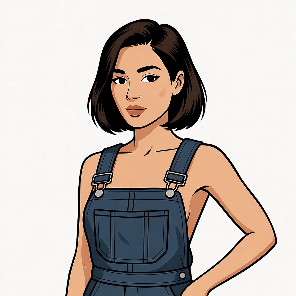 Asian, blue denim, bob haircut, brown hair, cartoon, clipart, dark hair, denim overalls, fashion illustration, female, hands on hips, illustration, isolated background, overalls, portrait, sleeveless, standing pose, stylish woman, vector art, woman, young woman, Asian woman