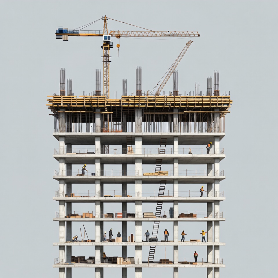 A tall multi-story building under construction features concrete floors, scaffolding, and cranes. Several workers in helmets and safety gear stand on various levels, using tools and ladders. Wooden beams and construction materials are visible throughout the structure against a clear sky.