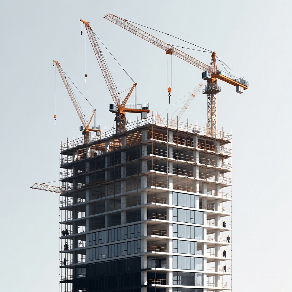 building construction, building site, city skyline, construction equipment, construction site, construction workers, cranes, development, elevated view, engineering, framework, girders, glass windows, heavy machinery, high altitude, high-rise, industrial, modern architecture, orange cranes, scaffolding, sky background, skyscraper, steel beams, tall building, tower crane, urban construction, workers, construction cranes