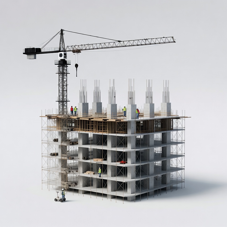 A 3D illustration shows a tall building under construction with multiple floors of scaffolding and concrete pillars. Several workers in yellow safety vests and helmets stand on various levels, operating equipment. A large crane looms over the site, and a worker with a cart stands at the base on a white background.