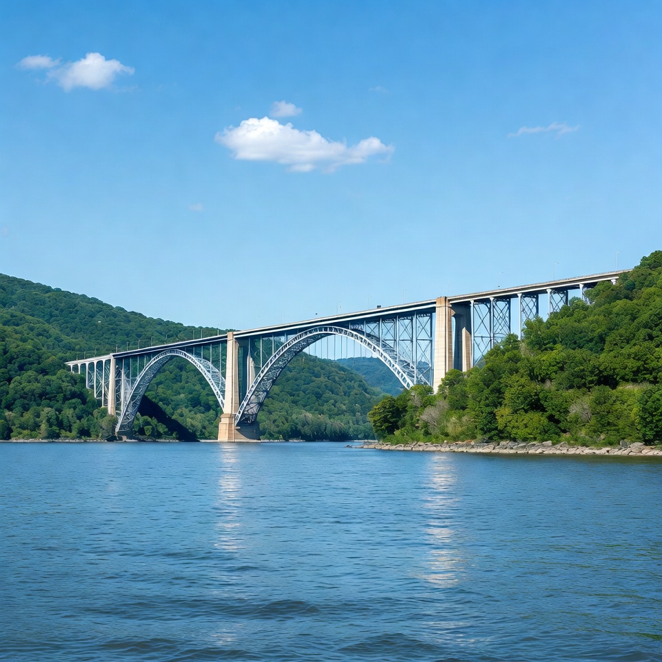 A tall steel arch bridge spans a calm blue river surrounded by lush green forested hills. Fluffy white clouds dot the clear blue sky above the structure. The bridge's intricate truss design is reflected in the water below.