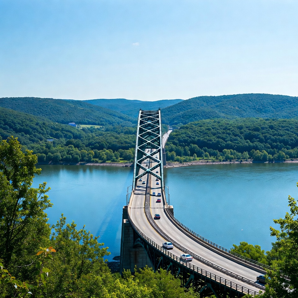 A large steel truss bridge spans a calm blue river surrounded by green forested mountains. Cars drive across the curved bridge under a clear blue sky. Lush trees frame the view from a high vantage point.