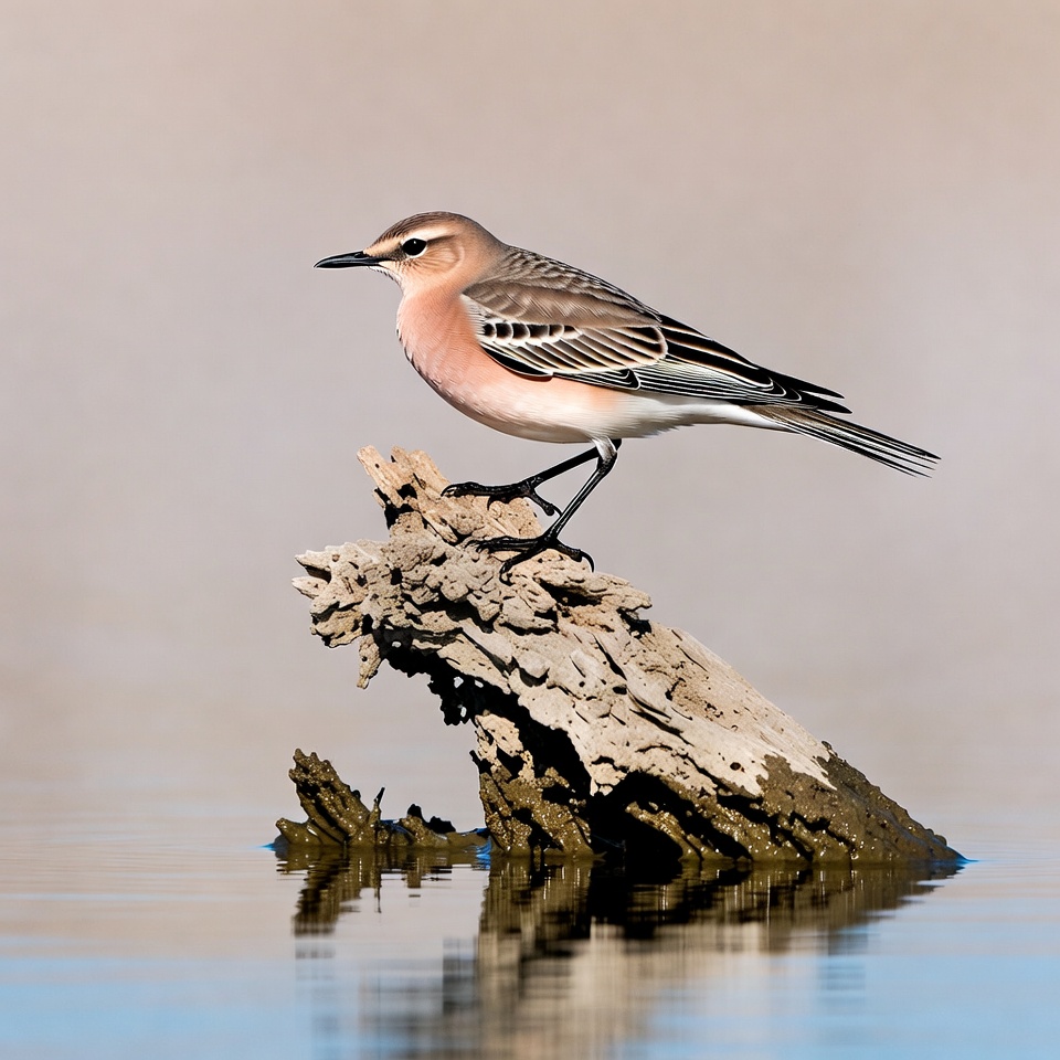 A northern wheatear bird with pale pinkish-brown plumage, black eye stripe, and white underparts stands on a weathered driftwood log. Its wings show brown-streaked feathers and white edges. The bird is reflected in shallow blue water below the log.