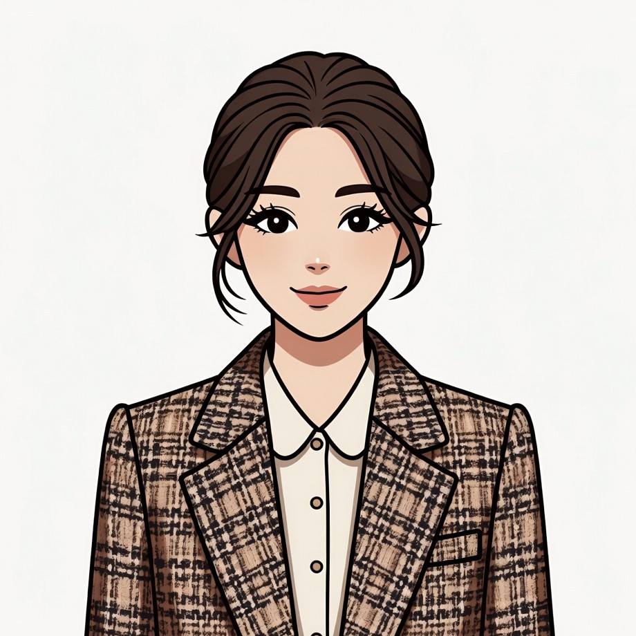 Asian, brown hair, business attire, cartoon woman, checkered jacket, collared shirt, female portrait, illustration, isolated background, plaid blazer, portrait, smiling woman, stylish woman, updo hairstyle, white shirt, woman, Asian woman