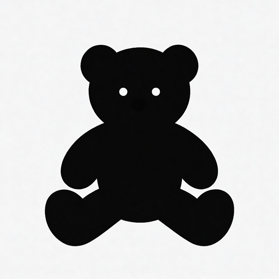 A simple black silhouette of a cute teddy bear sits on a white background. The bear has rounded ears, eyes, and paws with a friendly appearance. It is depicted in a sitting position with stubby legs.