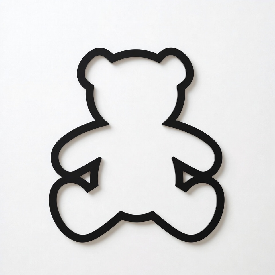 A simple black outline silhouette of a teddy bear is centered on a white background. The bear sits with its legs extended forward and paws resting on its lap. The design features rounded ears, a snout, and basic body contours.
