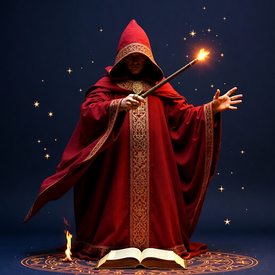 A man dressed in a red hooded robe and gold-trimmed cloak stands on a magical circle with an open book. He holds a glowing wand in his right hand producing fire and extends his left hand dramatically. The dark blue background is adorned with sparkling stars.