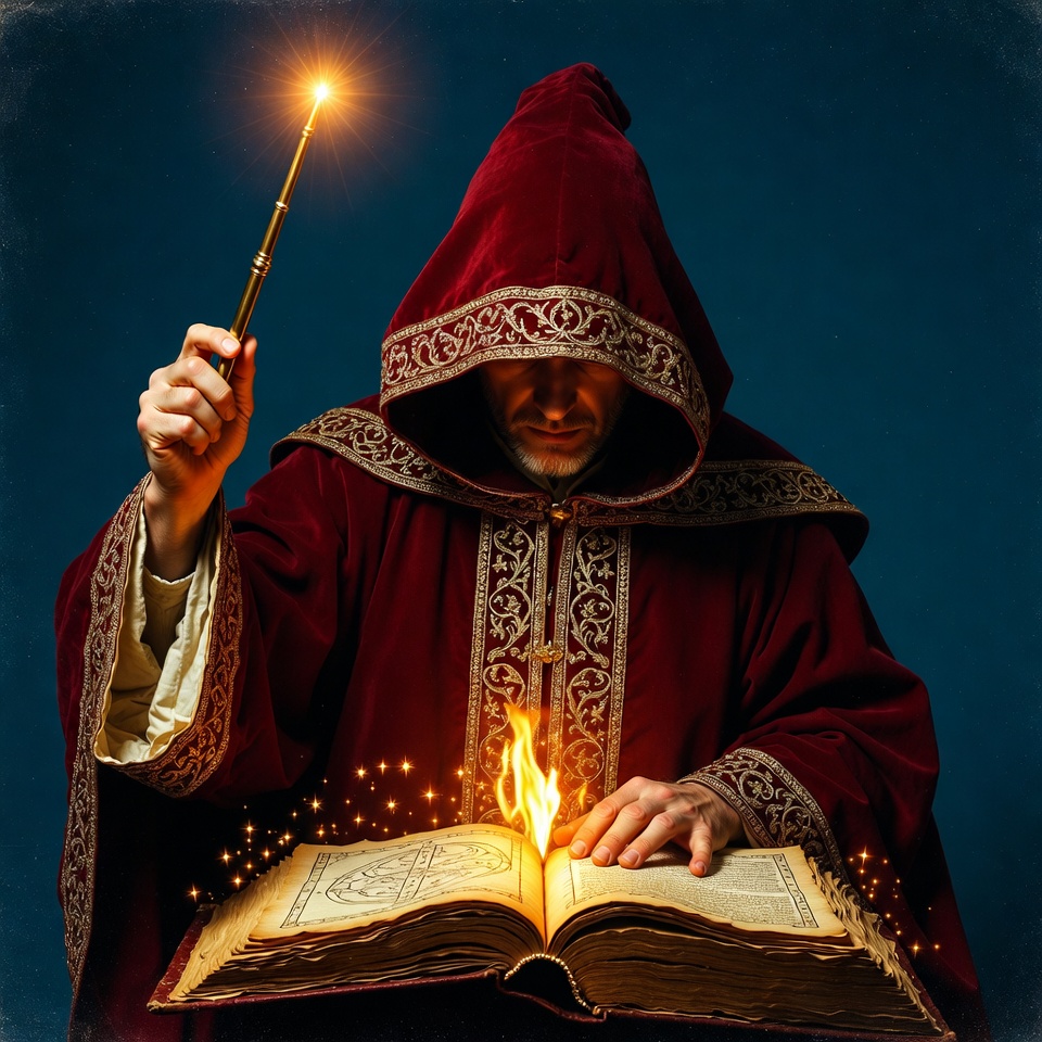 A man dressed in an ornate red hooded robe and cloak holds a glowing wand emitting golden sparks over a large ancient open book. Magical flames and sparkles rise from the book's pages as he gestures with both hands. The scene features a dark mystical background with a vintage filter.