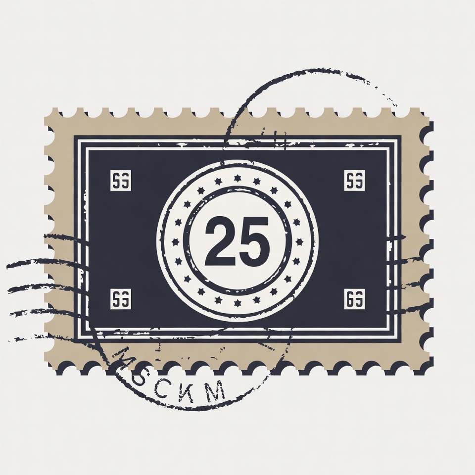 A vintage-style postage stamp illustration features the number 25 prominently in a black circular emblem with white stars. The stamp has a beige border, perforated edges, and postmark ink smudges. It is isolated on a white background.