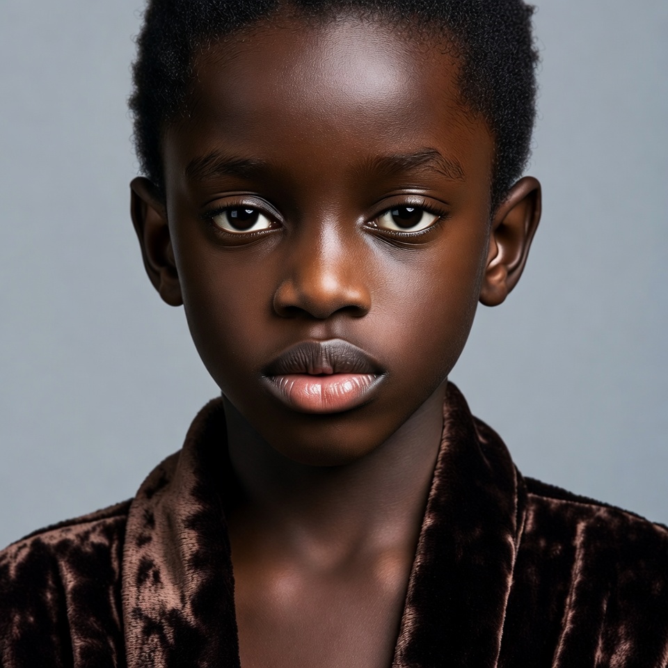 A young African boy with short curly black hair stares directly at the camera against a plain gray background. He has smooth dark skin, large expressive eyes, and full lips. He wears a brown velvet jacket with a subtle pattern.