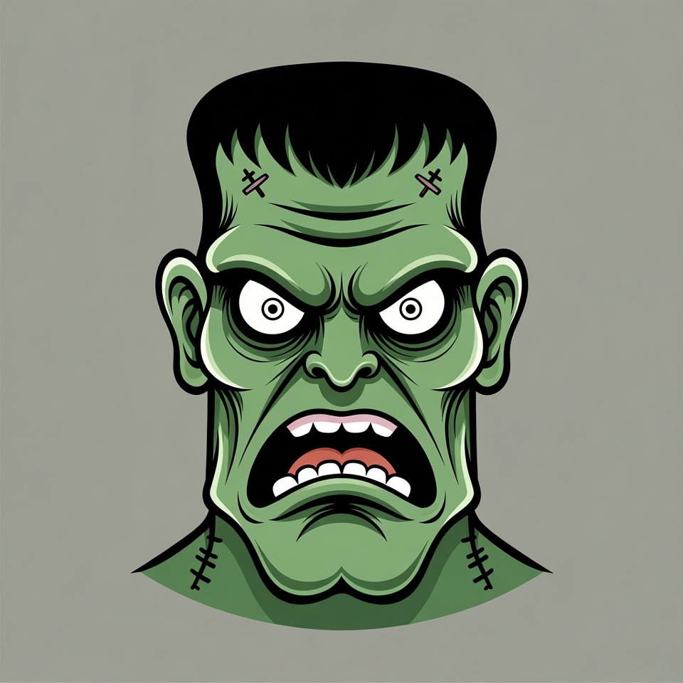 A cartoon illustration of Frankenstein's monster with green skin, black flat-top hair, and prominent stitches on the forehead and neck. The monster has bulging white eyes, furrowed brows, and a wide-open mouth showing sharp teeth in an angry expression. It is depicted on a plain gray background.