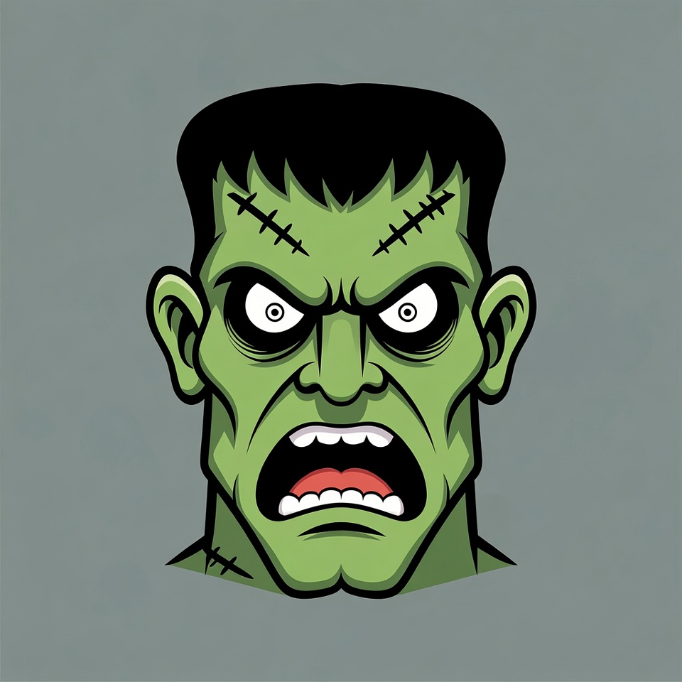 Frankenstein, Halloween, angry face, black hair, cartoon, clipart, green skin, illustration, isolated background, monster, roaring mouth, sharp teeth, stitches, vector art, white eyes, Frankenstein monster